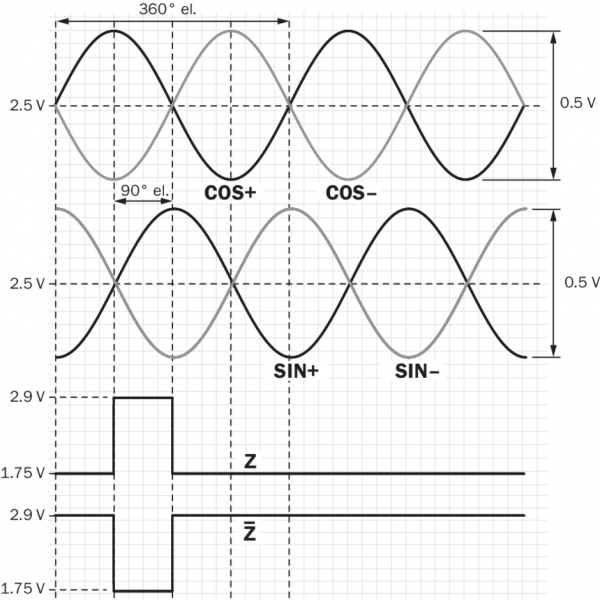 | Базовый сигнал, положение | 90°, электрические, логические соединения с синусом и косинусом |