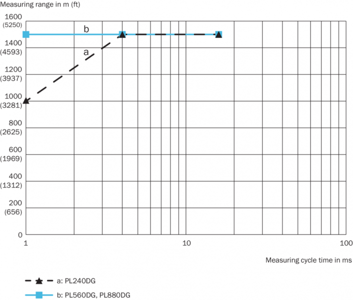 Тип подключения DME4/5xxx-xx4 DeviceNet, штекер 1 x M12, 5-конт., A-кодирование 1 x M16, 8-конт. Варианты настройки Диаграмма рабочих зон Диапазон измерения DL1000 по времени цикла измерения и типу отражателя Вид: Галерея Список Показать всё Скрыть всё