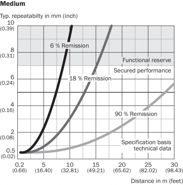 | Диапазон измерения | 200 mm ... 30.000 mm, 90 % отражения 1) 2) 200 mm ... 17.000 mm, 18 % отражения 200 mm ... 10.000 mm, 6 % отражения |