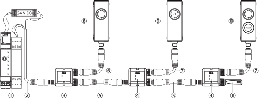 Пример схемы подключения Кнопка сброса ER12 и последовательное подключение трех кнопок аварийного останова ES11 к контроллеру безопасности Flexi Soft