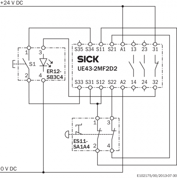 Пример схемы подключения Кнопка сброса ER12 и кнопка аварийного останова ES11 к защитному реле UE43