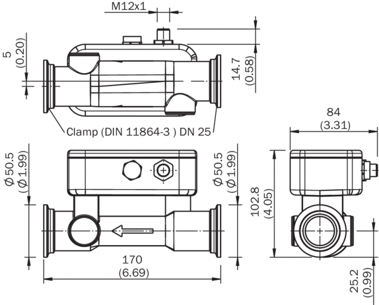 Габаритный чертеж DN 25, зажим (DIN 11864-3)