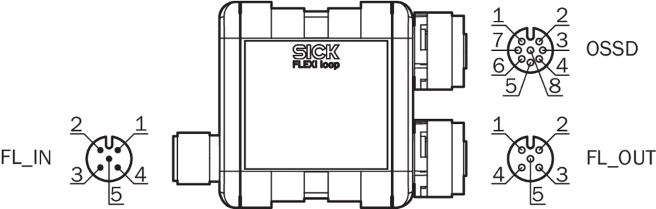 Применение подключений | Подключение контроллера безопасности | Для датчика безопасности с двухканальными выходами OSSD, Со стандартным входом, Со стандартным выходом | Вход Flexi Loop | Для соединения с предшествующим узлом Flexi Loop или для подключения линии Flexi Loop к контроллеру безопасности Flexi Soft. | Выход Flexi Loop | Для соединения с последующим модулем Flexi Loop или для завершения линии Flexi Loop терминатором Flexi Loop |
