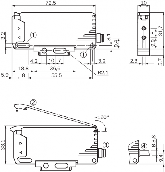 0 mm ... 1.100 mm, Система на пересечение луча 3)