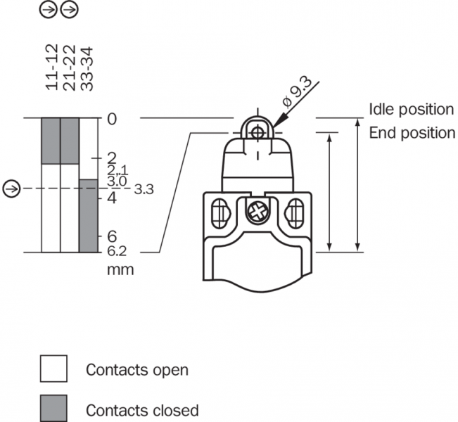 | Безопасное состояние в случае возникновения ошибки | Выключатель не имеет внутренней функции обнаружения ошибок и в случае неисправности не может перейти в безопасное состояние. Обнаружение ошибок осуществляется с помощью подключенного логического блока, направленного на обеспечение безопасности. |