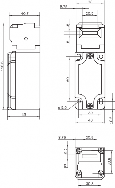Диаграмма ходов переключения Отображение контактов при извлечении пускателя (полностью вставлен = 0 мм)