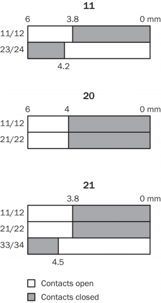 Диаграмма ходов переключения Отображение контактов при извлечении пускателя (полностью вставлен = 0 мм)