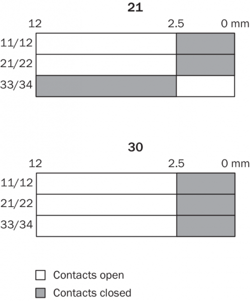 Диаграмма ходов переключения Отображение контактов при извлечении пускателя (полностью вставлен = 0 мм)