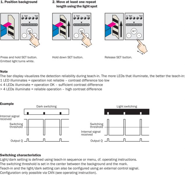 | Вход, настройка (ET) | PNP Teach: U = 10 V ... < UV Run: U < 2 V |