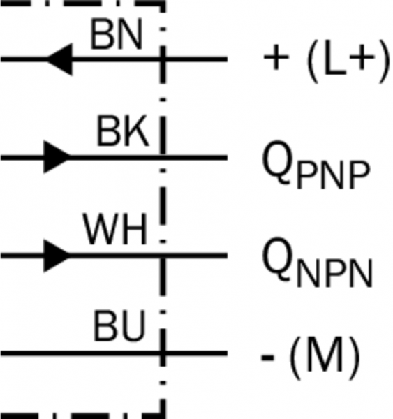 | Дискретный выход (напряжение) | PNP: HIGH = UВ– ≤ 2 В/LOW прибл. 0 В NPN: HIGH = прибл. UВ/LOW ≤ 2 В |