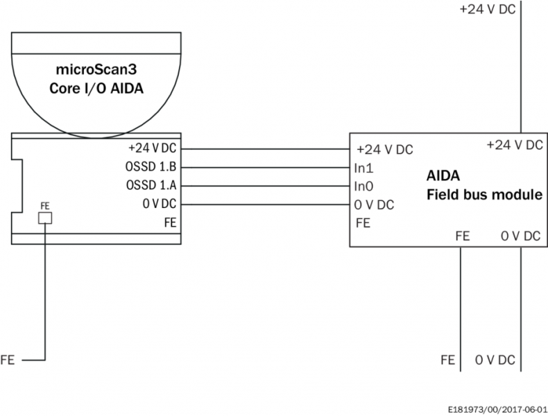 Пример схемы подключения microScan3 Core I/O AIDA с FE на альтернативном разъеме FE