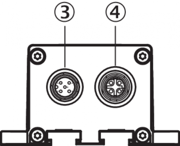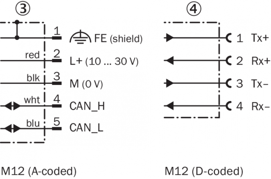 Схема соединений OLM100-10x6 1 x гнездо M12, 4-конт.1 x штекер M12, 5-конт.