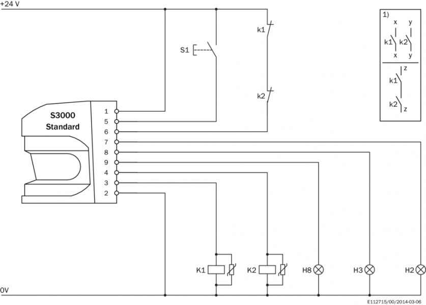 Габаритный чертеж Пример схемы подключения S3000 Standard с блокировкой повторного запуска и контролем контакторов, а также защитное реле UE10-3OS Пример схемы подключения S3000 Standard с блокировкой повторного запуска и контролем контакторов Вид: Галерея Список Показать всё Скрыть всё