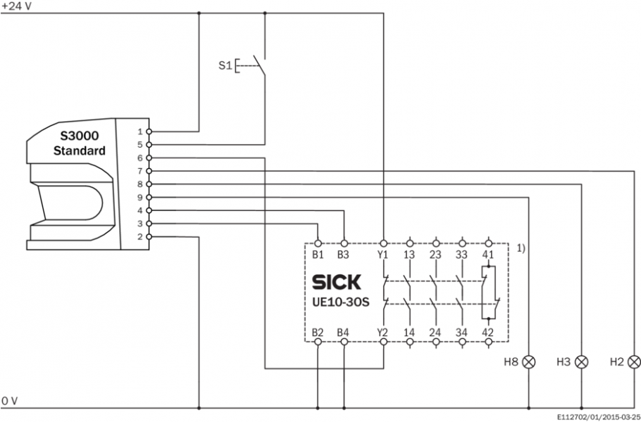 Пример схемы подключения S3000 Standard с блокировкой повторного запуска и контролем контакторов, а также защитное реле UE10-3OS
