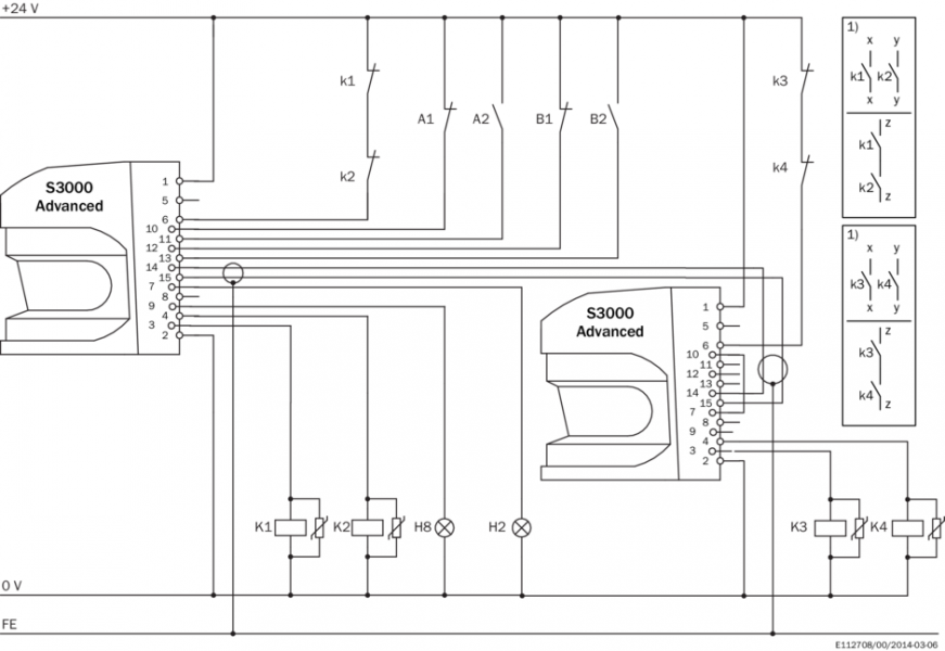 Пример схемы подключения Переключение защитного поля между двумя S3000 посредством статических входов