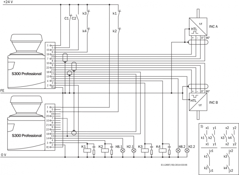 Пример схемы подключения Переключение защитного поля между двумя S300 посредством статических и динамических входов