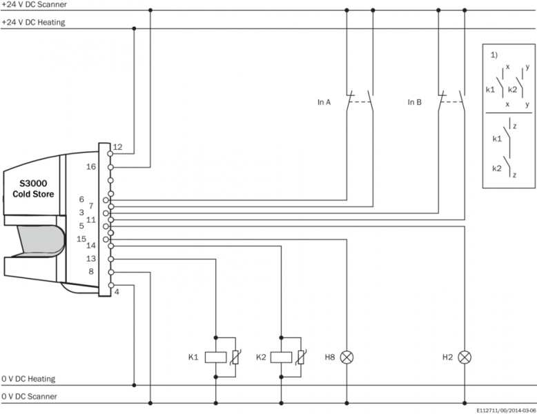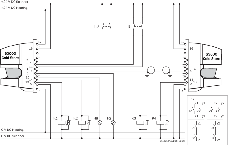 Пример схемы подключения Переключение защитного поля между двумя S3000 посредством статических входов