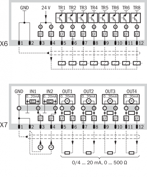 | Цифровые выходы | 8 Релейные контакты:30 V AC, 500 mA / 48 V DC, 500 mAТри релейных выхода по умолчанию для сигнализации неисправностей, сервиса и технического обслуживания 8 Транзисторные выходы:24 V DC, 500 mAСвободная настройка |