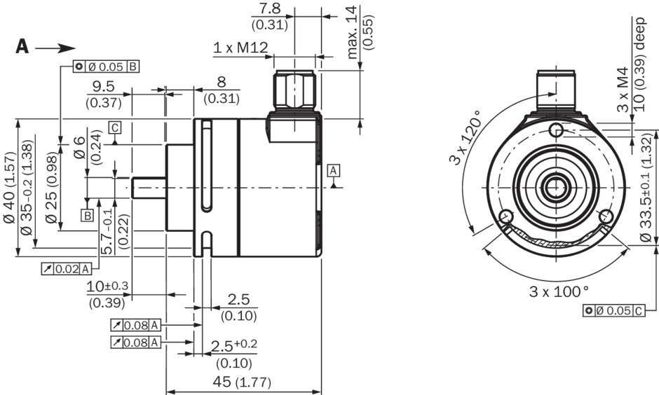 | Кривая кода | С возрастанием, при вращении вала. По часовой стрелке, если смотреть в направлении A (см. размерный чертеж)., При повороте вала по часовой стрелке, если смотреть в направлении A (см. размерный чертеж) |