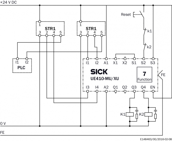 Пример схемы подключения Транспондерный выключатель безопасности STR1 с защитным реле UE48-2OS