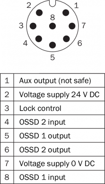 | Безопасное состояние в случае возникновения ошибки | Как минимум один полупроводниковый выход безопасности (OSSD) находится в состоянии AUS (ВЫКЛ.). |