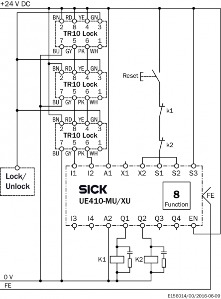 Габаритный чертеж Датчик с кабелем Габаритный чертеж Пускатель и крепежный уголок Схема соединений Последовательное подключение с помощью тройника (без диагностики) Пример схемы подключения Защитное запирающее устройство TR10 Lock с защитным реле UE48-2OS Пример схемы подключения Три последовательно подключенных защитных запирающих устройства TR10 Lock на контроллере безопасности Flexi Classic Вид: Галерея Список Показать всё Скрыть всё