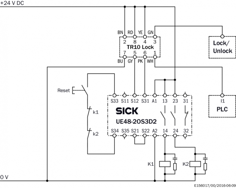 Пример схемы подключения Защитное запирающее устройство TR10 Lock с защитным реле UE48-2OS