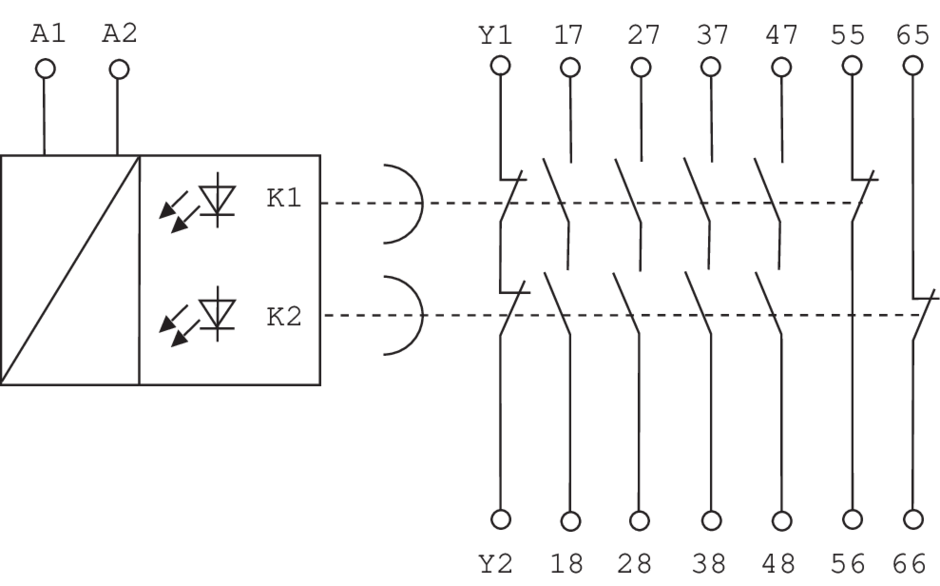 - Электрические данные - Выходные токопроводящие линии: 17/18, 27/28, 37/38, 47/48, 55/56, 65/66, Y1/Y2