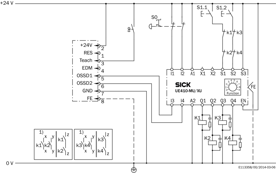 Пример схемы подключения Надежная система камер с защитным реле UE10-3OS