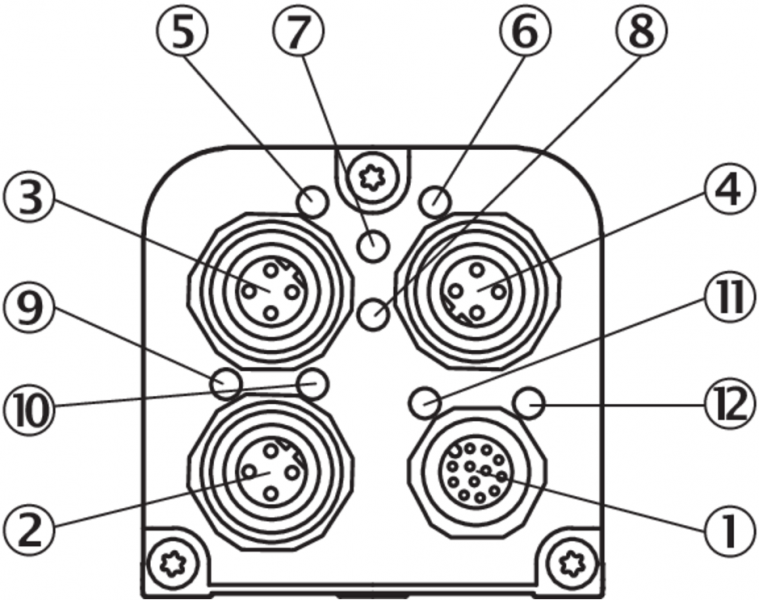 | Соединения | M12, 12-контактный штекер M12, 4-контактный гнездовой разъем |