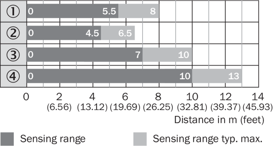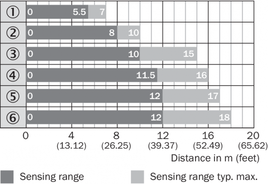Диаграмма расстояний срабатывания Стандартные отражатели