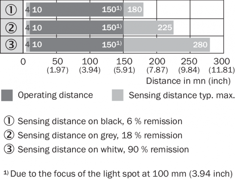 | Особые свойства | Диаметр светового пятна 2,5 мм на расстоянии 150 мм Уменьшенное расстояние срабатывания 280 мм |