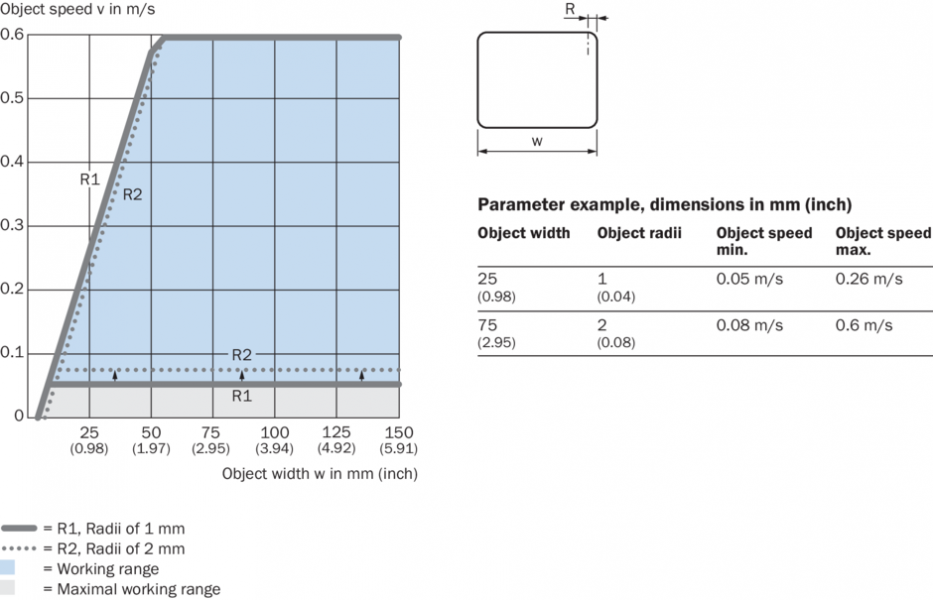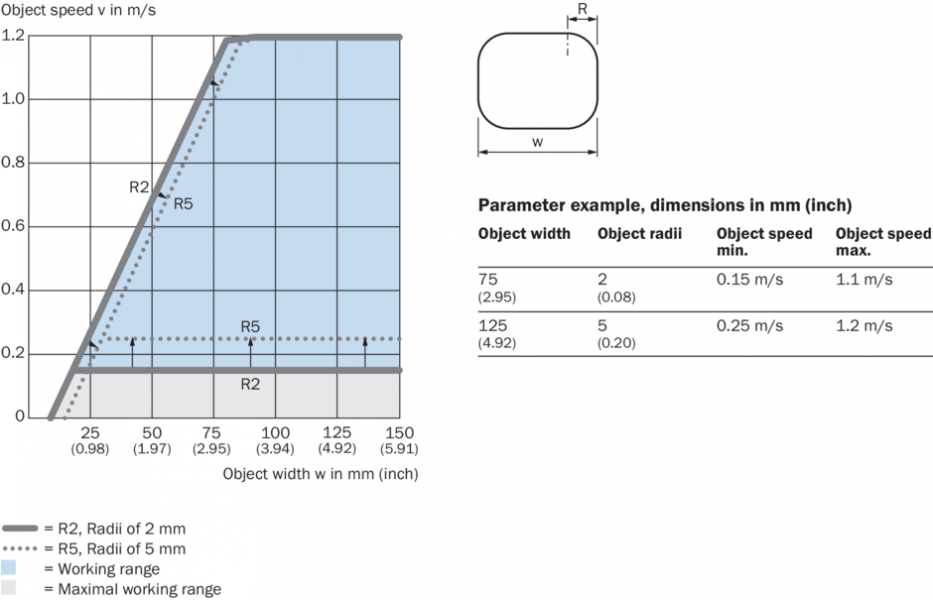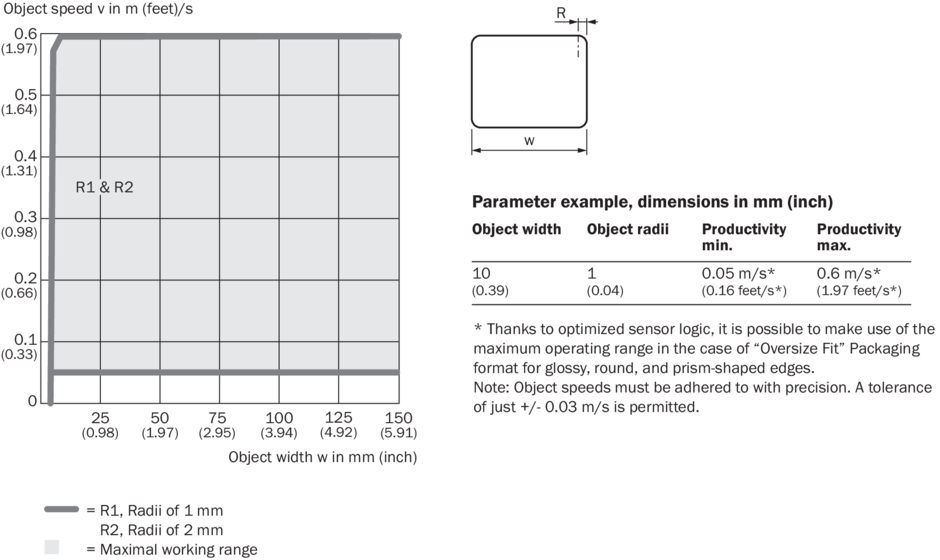 | Режим работы Packaging «Oversize Fit» | Основной признак объекта: блестящие и призматические кромки Подавление заднего фона: ≥ 60 мм Высота объекта, мин.: ≥ 30 мм Ширина объекта, мин.: ≥ 30 мм Радиус контура объекта: 5–20 мм Расстояние срабатывания: 30–40 мм |