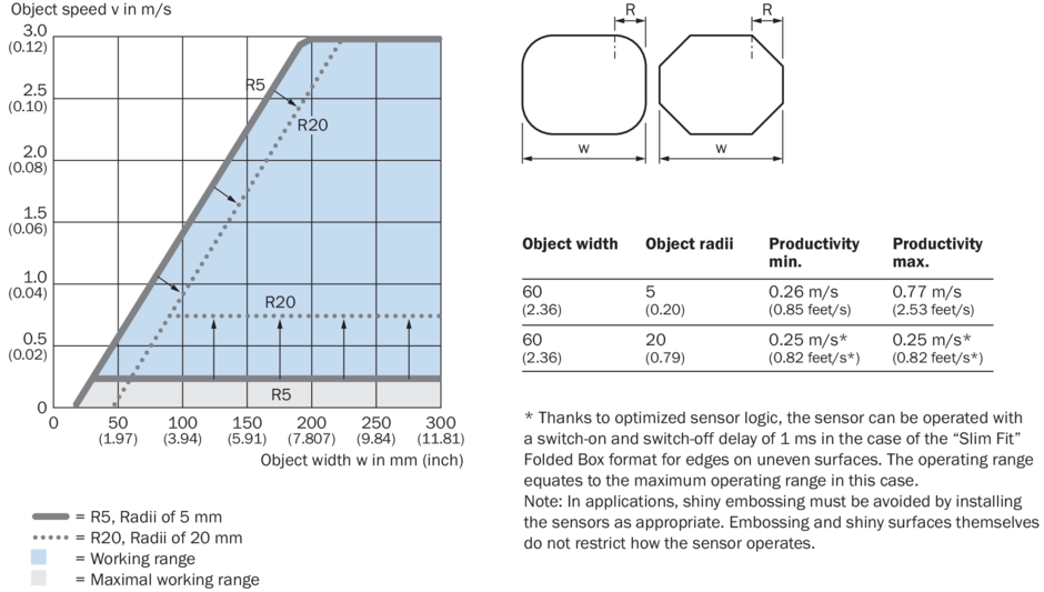 | Режим работы Folded Box «Slim Fit» | Основной признак объекта: кромки неровных поверхностей Подавление заднего фона: ≥ 60 мм Высота объекта, мин.: ≥ 30 мм Ширина объекта, мин.: ≥ 10 мм Радиус контура объекта: 1–2 мм Расстояние срабатывания: 30 мм ± 2 мм |