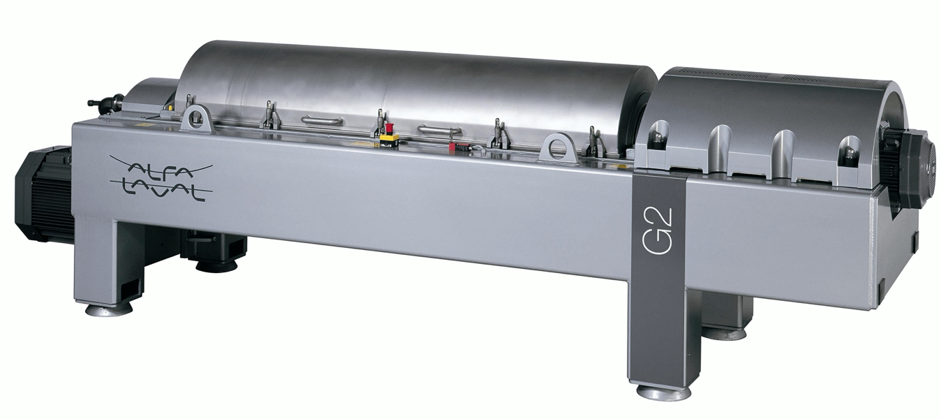 открытая горизонтальная декантерная центрифуга, работающая при атмосферном давлении. Состоит из закрытого барабана и шнека спирального типа, режим работы – противоточный. Центрифуга спроектирована и изготовлена для постоянной работы со стандартной скоростью вращения барабана до 4000 об/мин (3250G). Все части центрифуги, контактирующие с рабочими средами, изготовлены из дуплекса или нержавеющей стали марки AISI 316, за исключением уплотнений, питательной трубы и износостойких элементов. Лопасти конвейера имеют защиту от износа, выполненную из карбида вольфрама ТМ42. Остальные износостойкие элементы выполнены из стеллита. Резиновые уплотнения из нитрила. Труба подачи ила выполнена из нержавеющей стали.