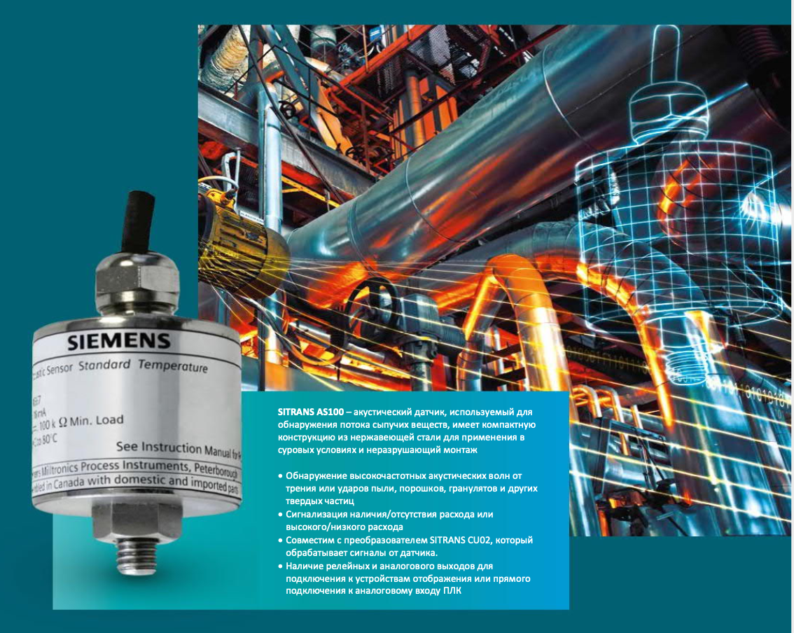SITRANS AS100 – акустический датчик, используемый для обнаружения потока сыпучих веществ, имеет компактную конструкцию из нержавеющей стали для применения в суровых условиях и неразрушающий монтаж