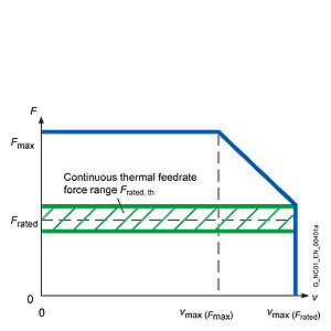 Линейные моторы 1FN6 обладают высокой перегрузочной способностью. Максимальный момент FMAX может быть достигнут только на скорости до vMAX(FMAX); на скорости до vMAX(Frated),   достижим всегда только момент Frated .