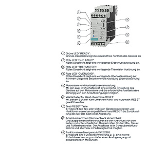 В дополнение к описанной обратнозависимой от тока задержке срабатывания защиты, предотвращающей чрезмерные перегревы двигателей, электронные реле перегрузки 3RB22/3RB23 также позволяют осуществлять прямой контроль температуры обмоток двигателей (полная защита двигателей) путем отказоустойчивого присоединения цепей датчика температуры PTC. С этой температурозависимой защитой двигатели могут быть защищены от перегрева, вызванного уменьшением потока охлаждающего воздуха, которое, например, не может быть обнаружено только путем контроля тока. В случае перегревания устройство отключает контактор и, таким образом, двигатель посредством вспомогательных контактов. О состоянии расцепления сигнализирует постоянно светящийся красный светодиод "Thermistor" (Термистор).