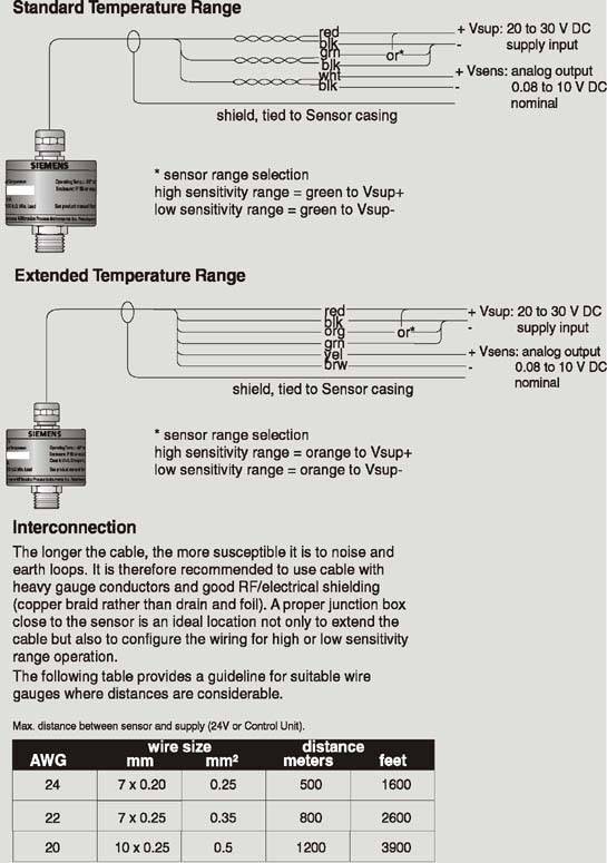 | Конструкция | | Стандартная | Стандартный диапазон рабочих температур | Расширенная | Расширенный диапазон рабочих температур | Эксплуатация | | Относительная чувствительность | 0.5% / ºC значения индикации, среднее значение на рабочий диапазон | Выход | Аналоговый, 0,08 до DC 10 V номинально, мин. нагрузка 100 KΩ | Условия использования | | Рабочая температура для корпуса | | | -20 до +80 °C (-4 до +176 °F) | | -40 до +125°C (-40 до +257 °F) | Конструктивные особенности | | Вес | 0.4 кг (1 lb) | Корпус | Housing: AISI 304 (1.406) нерж. сталь (нерж. сталь 303 версии Class II) | Класс защиты | IP68 (водонепроницаемый) | Кабель | | | 4 м (13 ft) кабель, обшивка PVC, 3 скрученные пары, 24 AWG, экранированный | | 4 м (13 ft) кабель, обшивка из термопластичного эластомера, 6-ти проводный, 24 AWG (0.25 мм2), экранированный | Питание | 20 до 30 V DC, 18 мА (typical) | Допуски | CE, как опция FM/CSA Class II, Div. 1, Group E, F и G | |