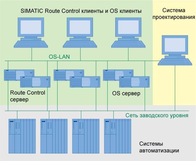 Дизайн Модульность и гибкость SIMATIC Route Control оптимально поддерживаются доступным аппаратным обеспечением. Все базовые аппаратные конфигурации, описанные в разделе "Базовые платформы для ES/OS/BATCH/IT", могут быть использованы для SIMATIC Route Control. Аппаратное обеспечение для небольших предприятий В случае установки небольшой мощности возможна установка пакетов Route Control Center и Route Control Server на том же компьютере, где установлено и работает программное обеспечение одиночной станции. Клиент/ серверные конфигурации В случае многопользовательской структуры, совместное использование аппаратного обеспечения пакетами Route Control Server, Batch Server и OS Server также возможно. Однако, надежность и производительность будут лучше, если они установлены на раздельные персональные компьютеры. Система оперативного управления SIMATIC PCS 7 V6.0 способна использовать до 12 обычных или резервированных OS-серверов. К данным одного обычного или резервированного OS-сервера могут получать доступ до 32 OS-клиентов. Мультиклиенты могут получать доступ к данным, хранящимся на всех OS-серверах системы. RC клиенты представлены пакетом Route Control Center (RCC). RCC может быть установлен на любой OS или Batch клиент или отдельную клиентскую станцию. RC серверы и OS/RC одиночные станции могут быть подключены к Industrial Ethernet посредством коммуникационного процессора СР1613 или обычной сетевой платы. Резервирование Резервирование RC серверов поддерживается пакетом SIMATIC Route Control Server. В отличии от OS серверов, для реализации этой функции не требуется никакого дополнительного программного или аппаратного обеспечения. Компоненты расширения Базовые станции (персональные компьютеры) могут быть расширены в зависимости от требований заказчика следующими опциями: - Multi-VGA плата для подключения до 4 мониторов