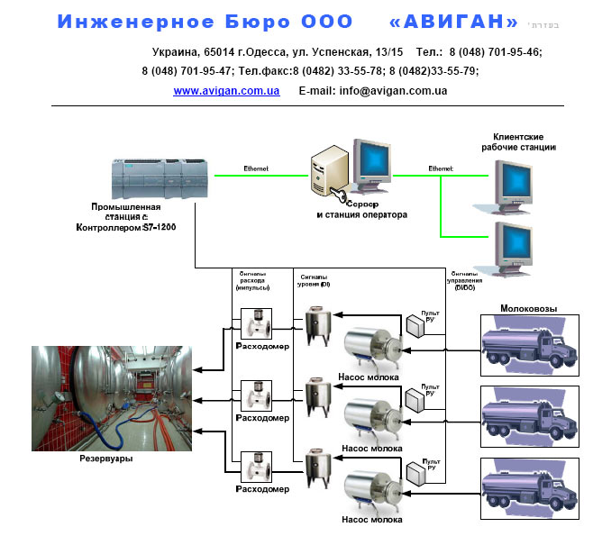 Система построена на базе промышленного контроллера Siemens с модулями входных выходных сигналов и контрольно измерительных приборов Siemens (датчики расхода -расходомеры и датчики уровня молока в емкости) предназначена для автоматизированного учета молочной продукции с возможностью управления исполнительными механизмами (насосными агрегатами и задвижками и т.п.) по заданному технологическому алгоритму. Вся информация о продукции сохраняется в базе данных на серверной станции. К серверной станции подключены станции технолога и оператора Системы.