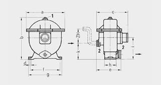 Чертеж Drum meter for industrial liquids, dimensions in mm (inch) | c1 | Without pulser | | c2 | With pulser | | IH | With an inlet open the atmospheric pressure, IH is the minimum height at which the inlet line must lie above the inlet connection in order for the maximum flow through the drum meter to be reached.. | | 1 | Screw plug G½ x 10 DIN 910 (only available for pressure-tight designs) | | 2 | Mating flanges (included in delivery) | | Meter size | a | b | c1 | c2 | Ø d | e | | l (USg) | mm (inch) | | 3 (0.8) | 375 (14.8) | 420 (16.5) | 368 (14.5) | 460 (17.7) | 11.5 (0.45) | 238 (9.4) | | 6 (1.6) | 386 (15.2) | 418 (16.5) | 517 (20.4) | 599 (23.6) | 11.5 (0.45) | 350 (13.8) | | 15 (4.0) | 585 (23.0) | 620 (24.4) | 561 (22.1) | 643 (25.3) | 15 (0.59) | 431 (17.0) | | Meter size | f | g | h | i | k | IH | | l (USg) | mm (inch) | | 3 (0.8) | 300 (11.8) | 330 (13.0) | 125 (4.9) | 220 (8.7) | 155 (6.1) | 200 (7.9) | | 6 (1.6) | 300 (11.8) | 330 (13.0) | 212 (8.4) | 228 (9.0) | 163 (6.4) | 250 (9.8) | | 15 (4.0) | 490 (19.3) | 530 (20.9) | 240 (9.5) | 340 (13.4) | 265 (10.4) | 300 (11.8) | |