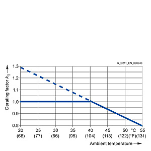 Высота установки 3000 м (9843 фт): Коэффициент снижения значений kI = 0,925, kU = 0,88Максимальная внешняя температура 35 °C (95°F): Коэффициент снижения значений kT = 1,066kI × kT = 0,925 × 1,066 = 0,987 ⇒ не полностью компенсируется значением высота установки/внешняя температураk = kf × (kI × kT) = 0,82 × (0,925 × 1,066) = 0,809Результат: Требуется снижение номинальных значений тока.Если применяются данные ограничения,