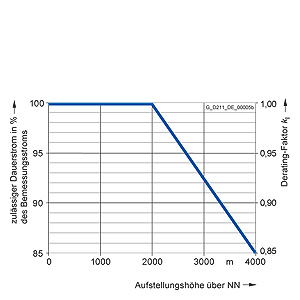 Для расчёта допустимого выходного тока или мощности, коэффициенты снижения номинальных значений должны быть умножены на эффекты, описанные выше. Коэффициент снижения номинального значения тока kI как функция высоты установки может быть измерен при помощи коэффициента снижения номинального значения внешней температуры kT. Если результат умножения коэффициента kT на коэффициент kI больше 1, тогда расчёт должен базироваться на номинальном токе Irated или Iratedf. Если результат <1, тогда для расчёта максимально допустимого значения непрерывного тока он должен быть умножен на значение номинального тока Irated или Iratedf. Рассчитанный данным способом для получения результирующего значения коэффициент снижения номинальных значений k = kf × kT × kI должен применяться ко всем значениям тока (Irated,IH, IL) в заданном рабочем цикле.