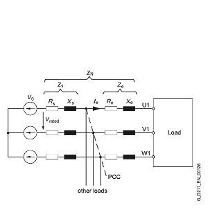 Снижение напряжения между системой электропитания и нагрузкой, обусловленное импедансом, наблюдается до тех пор, пока в цепи течёт ток. В симметричной трёхфазной системе электропитания это импеданс цепи Zn, который рассчитывается из импеданса Zs системы электропитания и импеданса Ze нагрузки.