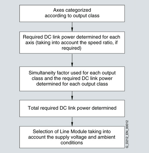 В приложениях с многоосевыми приводами, несколько Модулей Двигателя работают в одной цепи DC, к которой подаётся питание от Модуля Линии.Прежде всего, необходимо решить, какой Модуль Линии будет использоваться: Базовый (Basic), Интеллектуальный (Smart) или Активный (Active). Это зависит, с одной стороны, от способности привода к регенеративной обратной связи, а с другой стороны, от того, должна ли подача питания быть нерегулируемой и, таким образом, зависеть от напряжения источника питания, или регулируемой к постоянному напряжению цепи DC.Модули Линии формата книги доступны в интеллектуальном и активном форматах и оба поддерживают регенеративную обратную связь.Блоки формата шасси доступны с диапазоном напряжений от 380 В до 480 В, а также включают блоки в диапазоне от 660 В до 690 В. Базовые Модули Линии разработаны только для работы с подаваемой нагрузкой. Активные Модули Линии имеют регулируемую нагрузку и включают функцию повышения напряжения.Для расчёта требуемой в цепи DC мощности и выбора правильного Модуля Линии, важно проанализировать всю последовательность работы группы приводов, подключённых к цепи DC. Также должны учитываться и такие факторы, как частичная нагрузка, избыточность, рабочие циклы, коэффициент одновременности нагрузки и рабочий режим (режим двигателя / генератора).Мощность цепи DC Pd одного Модуля Двигателя, рассчитывается из мощности на валу двигателя Pmech и эффективности двигателя ηm и Модуля Двигателя ηwr.В режиме двигателя накладываются следующие ограничения: Pd = Pmech / (ηm × ηwr)В режиме генератора накладываются следующие ограничения: Pd = Pmech × ηm × ηwrДля расчёта общей мощности цепи DC, мощности двигателя и генератора должны добавляться с соответствующим знаком.Номинальная подаваемая мощность Модуля Линии относится к напряжению в сети в 380 В, 460 В или 690 В (690 В применяется только для Модулей Линии формата шасси). Колебания напряжения в сети могут повлиять на выходную мощность Модулей Линии. Несмотря на это, максимально возможная выходная мощность соответствует номинальной мощности блока соответствующего типа.В зависимости от внешних условий (высота установки, внешняя температура), может потребоваться снизить подаваемую к Модулям Линии мощность (смотрите соответствующее описание).Коэффициент одновременности нагрузки учитывает временную характеристику крутящего момента каждой отдельной оси.На основе этих принципов для определения величины Модуля Линии может быть использована следующая процедура: