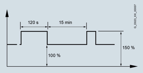 Указанный на типовой табличке преобразователя номинальный постоянный ток (максимально допустимый длительный ток) во время работы может превышаться. Для величины превышения и его длительности существуют границы, суть которых разъясняется ниже.