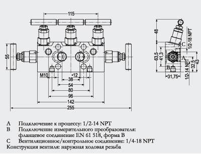 ДизайнВсе версии вентильных блоков имеют подключение к процессу ½-14 NPT. Соединение для измерительного преобразователя давления выполнено как фланцевое соединение по EN 61518, форма B. 2-х и 5-ти шпиндельный вентильный блок дополнительно имеет вентиляционное и контрольное соединение ¼-18 NPT. Вентили блока имеют наружнюю ходовую резьбу. Используемые материалы | Деталь | Материал | мат. No. | | Корпус | X 2 CrNiMo 17 13 2 | 1.4404/316L | | Конус | X 6 CrNiMoTi 17 12 2 | 1.4571/316Ti | | Шпиндели | X 2 CrNiMo 18 10 | 1.4404/316L | | Колпаки | X 5 CrNiMo 18 10 | 1.4401/316 | | Прокладки | PTFE | - | |