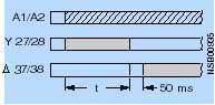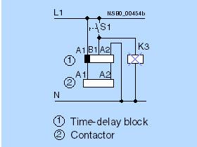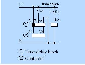 Исполнение с выдержкой времени при отключении с реле времени - катушка контакторы подключается  непосредственно через реле; зажимы A1 и A2 катушки не должны подключаться.