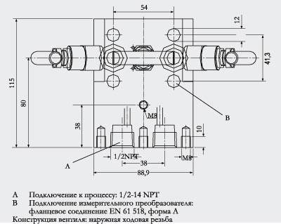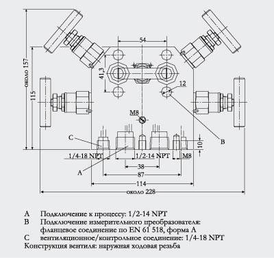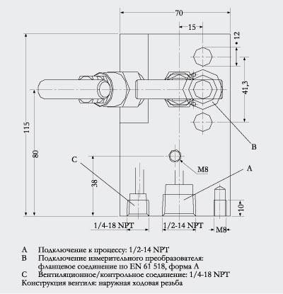 ДизайнВсе версии вентильных блоков имеют подключение к процессу ½-14 NPT. Соединение для измерительного преобразователя давления выполнено как фланцевое соединение по EN 61518, форма А. B. 2-х и 5-ти шпиндельный вентильный блок дополнительно имеет вентиляционное и контрольное соединение ¼-18 NPT. Вентили блока имеют наружнюю ходовую резьбу. Используемые материалы: | Детали | Материал | мат. No. | | Корпус | X 2 CrNiMo 17 13 2 | 1.4404/316L | | Конус | X 6 CrNiMoTi 17 12 2 | 1.4571/316Ti | | Шпиндели | X 2 CrNiMo 18 10 | 1.4404/316L | | Колпаки | X 5 CrNiMo 18 10 | 1.4401/316 | | Прокладки | PTFE | - | |
